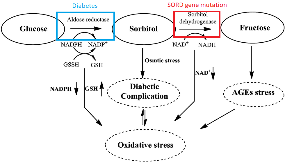 The protein encoding gene SORD (sorbitol dehydrogenase) that, in my case, has the even rarer mutation c.757delG (p.Ala253GlnfsTer27) is blocking sorbitol from being converted to fructose. This causes an osmotic influx of water and oxidative stress on my motor neurons, which cause similar effects to untreated diabetes. The difference is that I don’t have a problem with the (excess) conversion of glucose into sorbitol, but instead a blocked sorbitol-to-fructose pathway, leading to similar results.