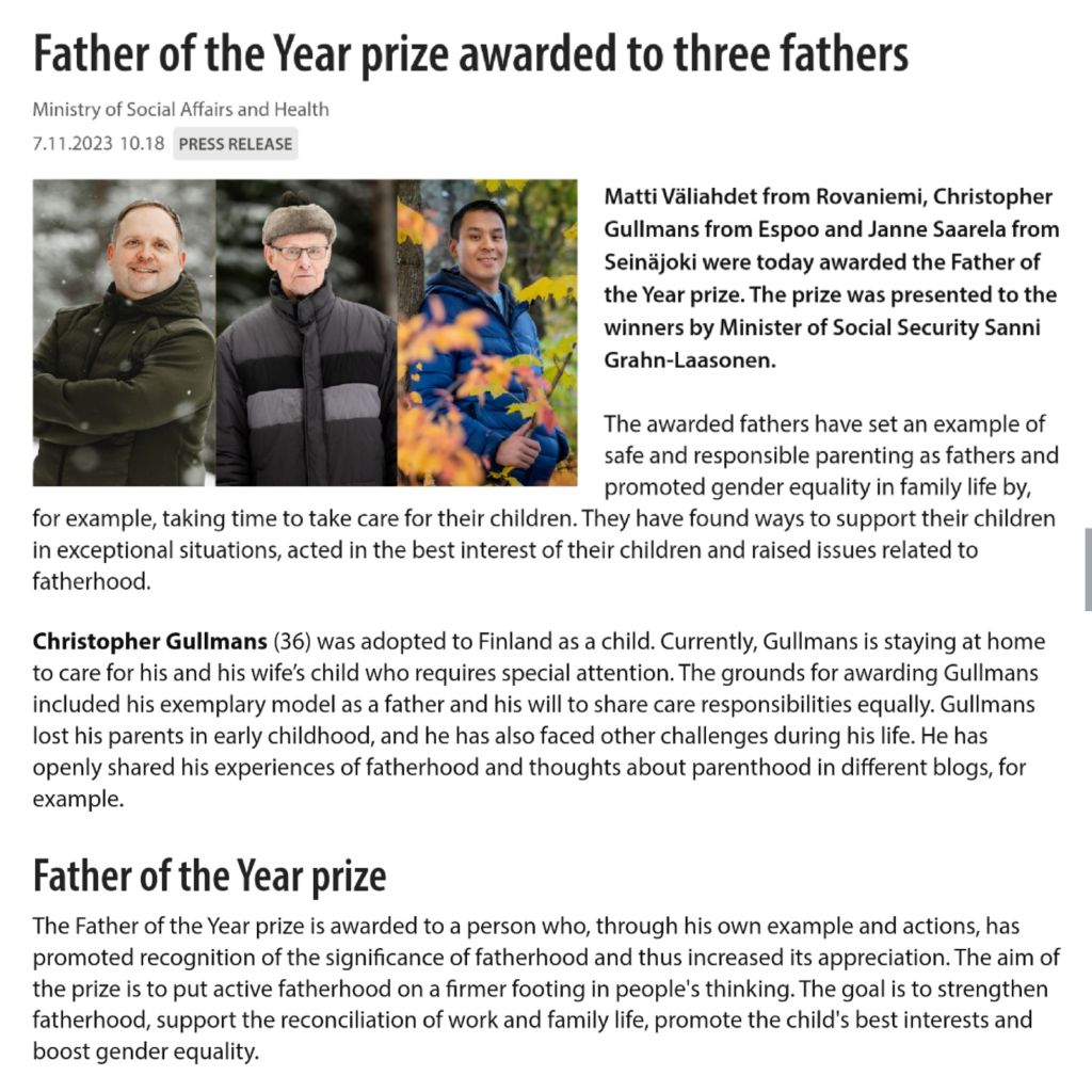 Alright, I don’t think the point of the award was to show off how perfect of a father I am, because God knows I’m just another man in Finland who struggles to make sure my kid is as happy as he can be. Sure, I have a past that is quite different from those around me, having been orphaned as a child, and sure, my son may have Down syndrome, but ultimately, I guess we all have our motivations for why we want to be there for our kids, to whatever extent we see fit.